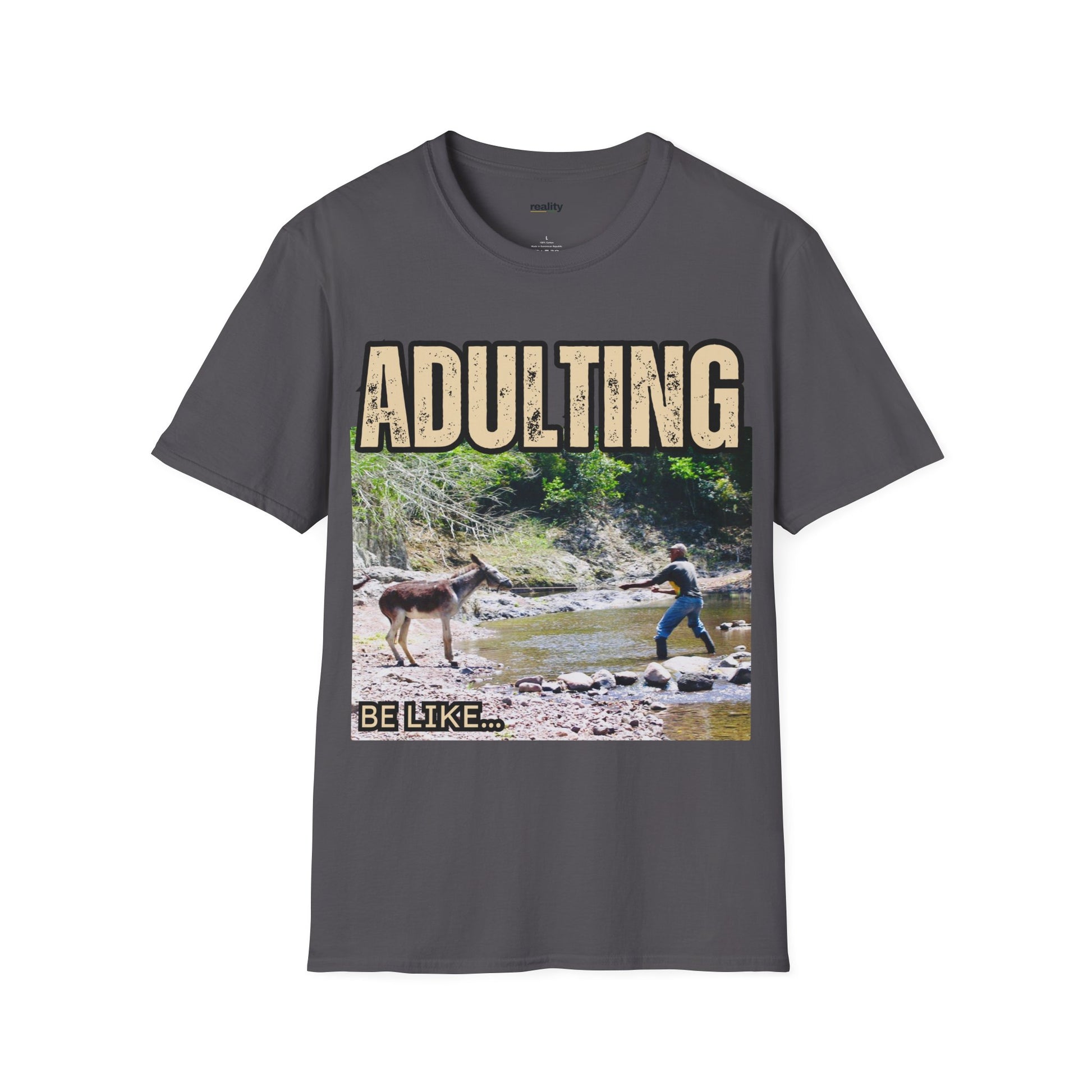 Life's a tug-of-war, just like trying to get that stubborn donkey across the water! Embrace the chaos of adulting with our hilarious tee that perfectly captures those everyday battles. Whether you're navigating responsibilities or just trying to keep your sanity, this shirt is your new go-to for laughs and relatable moments. Get yours today and wear your challenges with pride!" This description highlights the humor in the design while connecting it to the common challenges of adult life!.