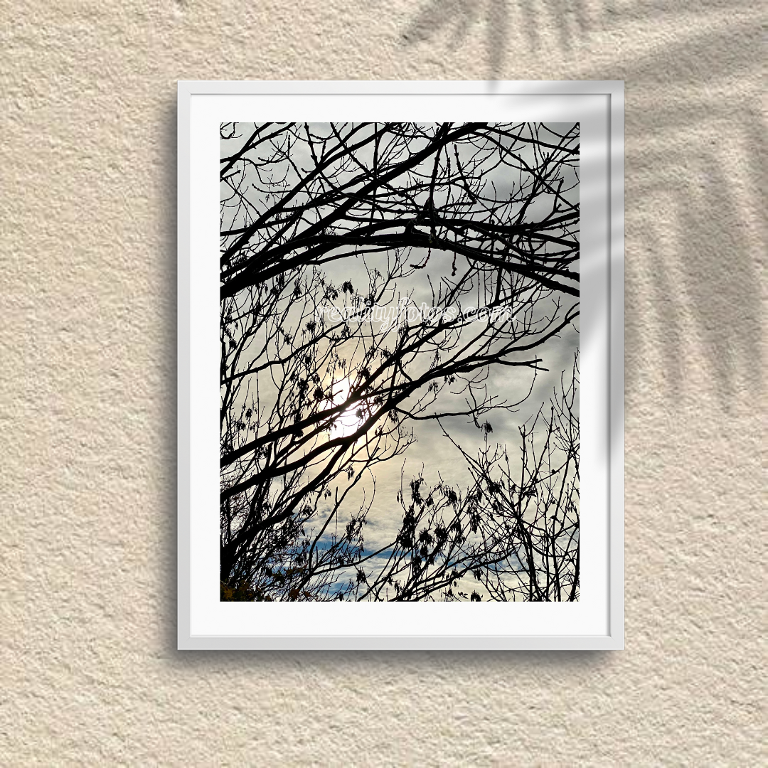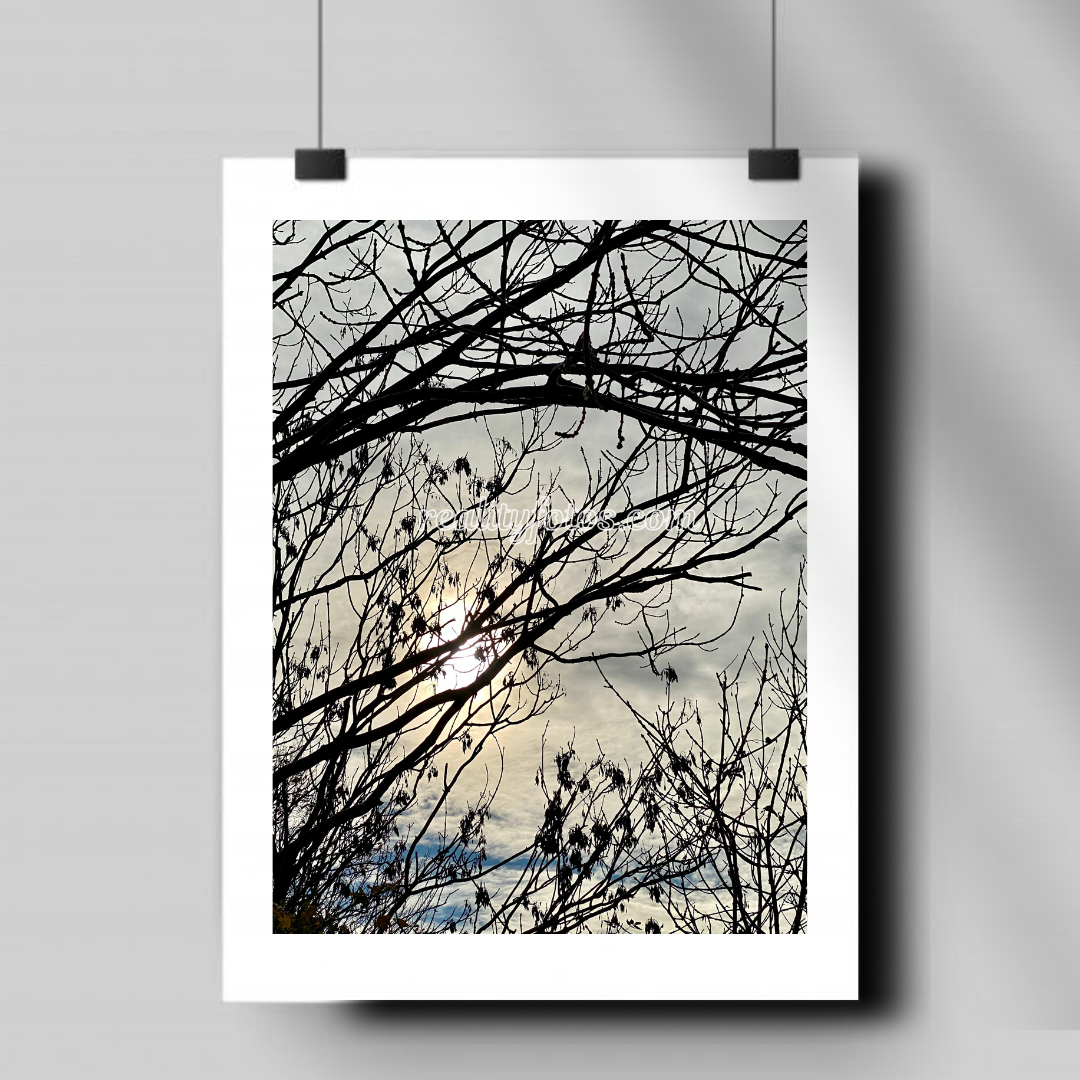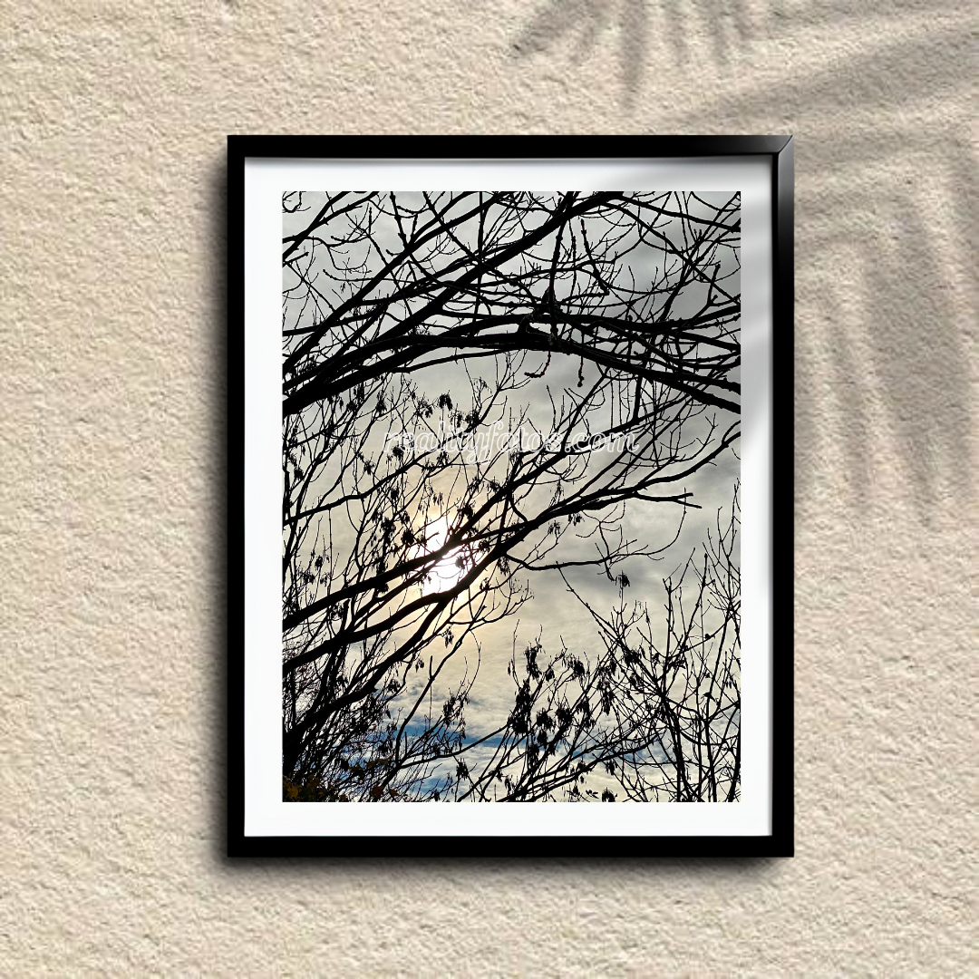 This enchanting image captures the magic of sunset as the sun peeks through the tree limbs, casting golden rays across the sky. The delicate branches frame the scene, creating a tranquil moment where nature meets the fading light of day. A peaceful reminder of the beauty in everyday transitions.