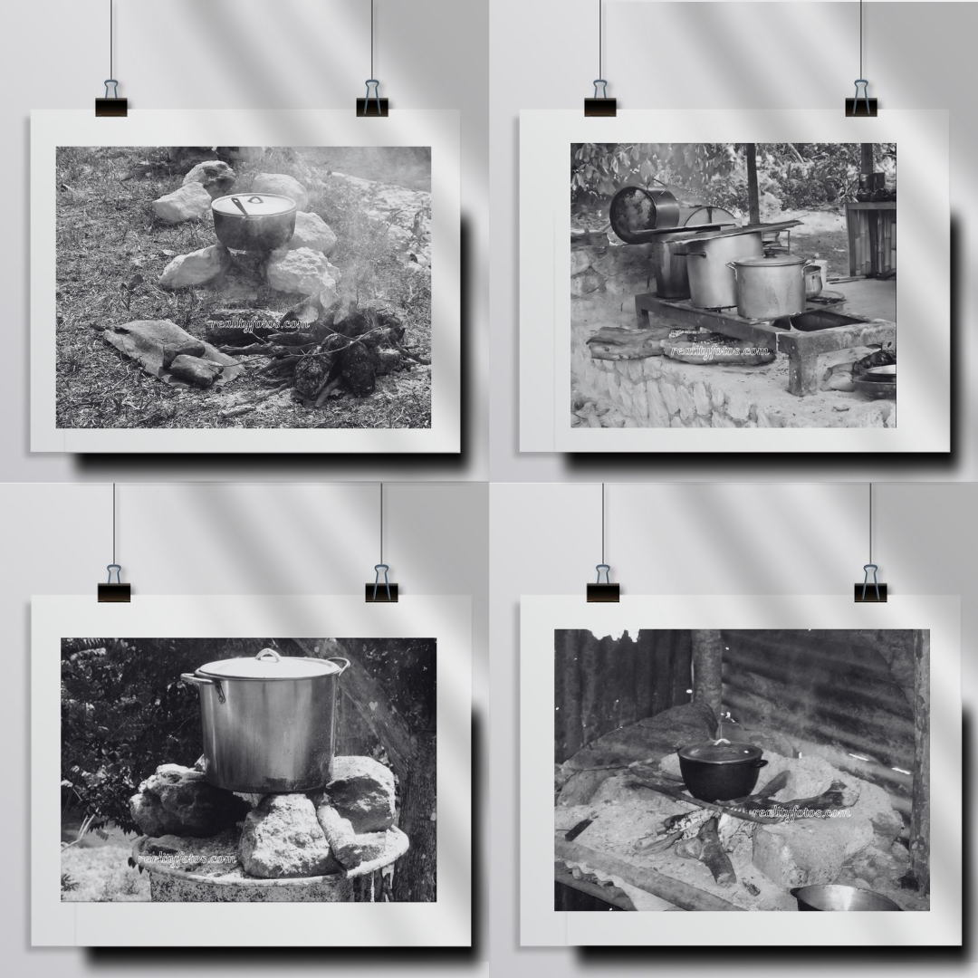 A rustic outdoor cooking scene featuring a well-seasoned Dutch pot set over an open fire, supported by a simple rock stove. This traditional method, commonly seen at festivals, markets, and rural gatherings, brings out rich, authentic flavors. In some images, a cook bends over to check the meal, adding a touch of daily life and cultural authenticity.